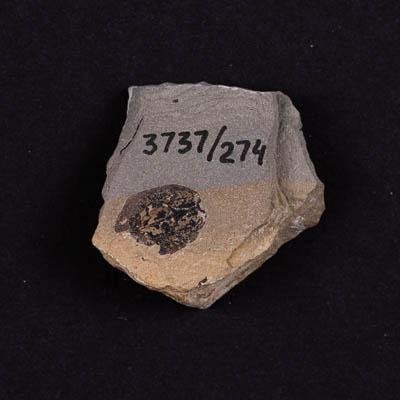 Отпечаток семени хвойного на породе. Порода представлена плотным алевролитом бежевого цвета.
