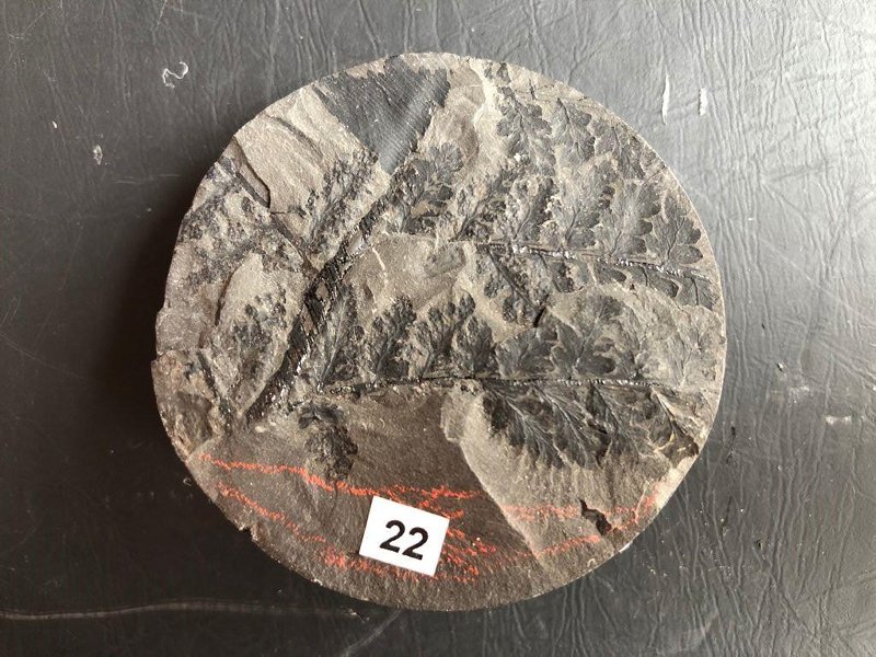 Образец в форме цилиндра. На нем сохранился отпечаток с фитолеймой средней части фертильного листа. Цвет породы серый. Порода представлена плотным алевролитом.