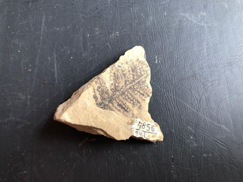 Образец неправильной формы. На нем сохранился отпечаток с фитолеймой средней части фертильного листа. Цвет породы бежевый. Порода представлена плотным алевролитом.