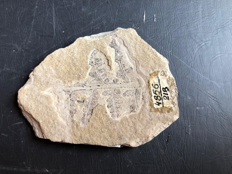 Образец неправильной формы. На нем сохранился отпечаток средней части фертильного листа. Цвет породы бежевый. Порода представлена плотным алевролитом.