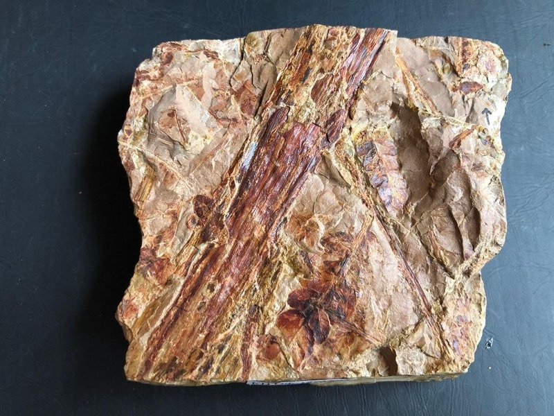 Образец неправильной формы. На нем сохранился отпечаток средней части фертильного побега. Цвет породы красновато-бежевый. Порода представлена слоистым алевролитом.