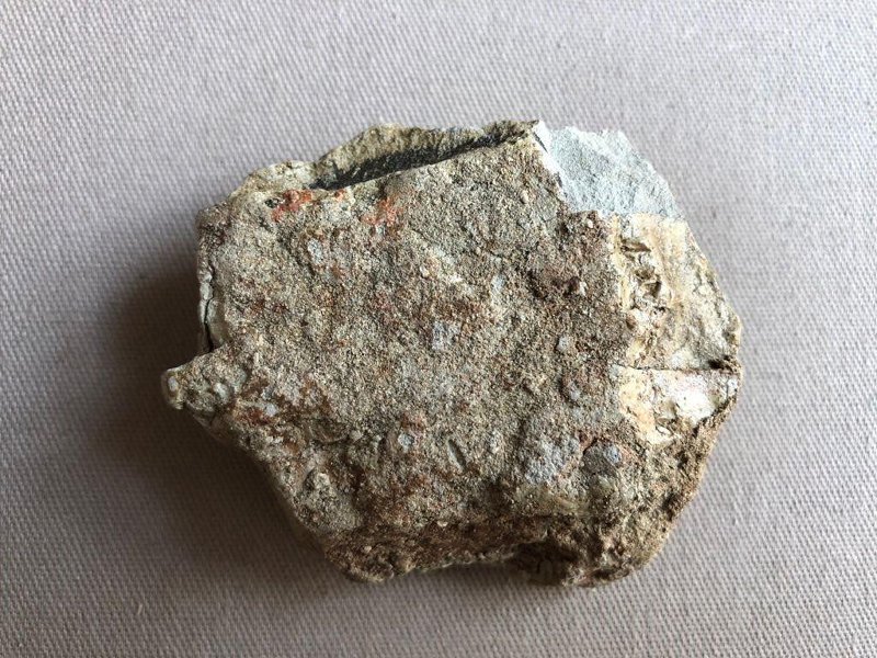 Образец неправильной формы. На нем сохранился обызвествленный остаток мегаспорофилла. Цвет породы зеленовато-серый. Порода представлена обызвествленным алевролитом.