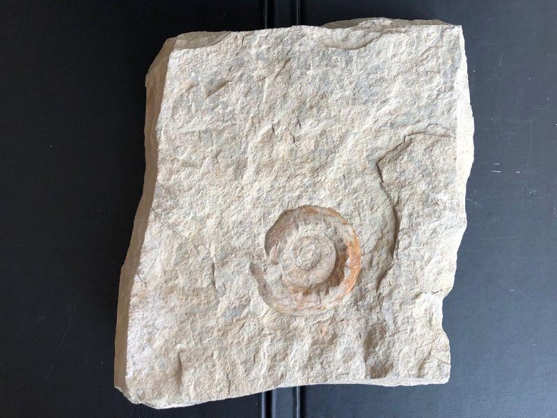Раковина в породе. Раковина моллюска полуинволютная с мелкими гребнями на боковой поверности. Лопастная линия цератитовая. Цвет раковины рыжевато-бежевый. Частично разрушена. Порода представлена плотным мергелем бежевого цвета.