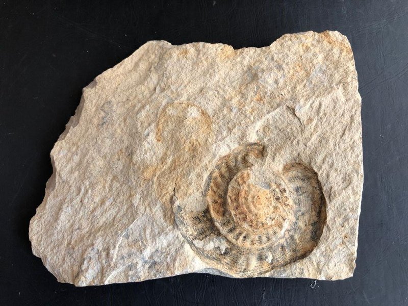 Половина раковины в породе. Большая часть раковины растворено, сохранилась лишь часть внешнего покрова и отпечаток раковины. Раковина моллюска полуинволютная с мелкими гребнями на боковой поверности. Порода представлена плотным мергелем бежевого цвета.