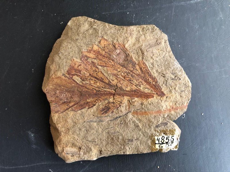 Отпечаток на субстрате. От единого черешка отходит несколько листовых пластин. Также сохранилась фитолейма, поэтому лист имеет коричневый цвет. Порода представлена плотным песчаником серовато-бежевого цвета.