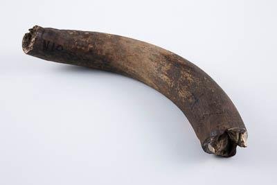 Бивень темного-бурого цвета, местами рыжеватый, с неглубокой полостью конуса роста. Дистальный конец обломан, возможно, посмертно. Следов залечивания или обтачивания не обнаружено. Край окислен,, что указывает на то, что скол не является свежим. Свежие сколы по бокам также присутствуют. Концентрические складки у основания бивня указывают на травму полученную при сильном ударе, возможно во время столкновения с хищником или с другим мамонтом.