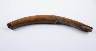 Бивень темно-бурого цвета, с неглубокой полостью конуса роста, с прижизненно обломанной и стертой дистальной частью.