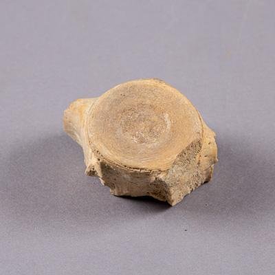 Тело позвонка кита, бежевого цвета. Окремнелое. Сохранились отверстия от сосудов и нервов. Сохранился фрагмент бокового отростка, основание дуги.