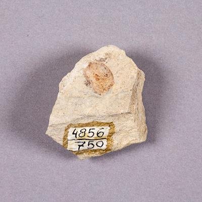 Отпечаток семени гинкгового на породе. Порода представлена плотным алевролитом бежевого цвета.