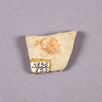 Отпечаток семени гинкгового на породе. Порода представлена плотным алевролитом бежевого цвета.