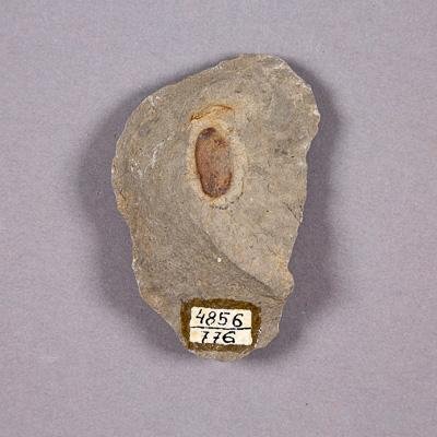 Отпечаток семени гинкгового на породе. Порода представлена плотным алевролитом бежевого цвета.