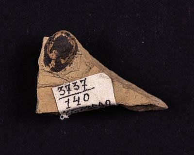 Отпечаток семени хвойного на породе. Порода представлена плотным алевролитом бежевого цвета.
