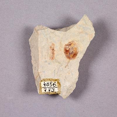 Отпечаток семени гинкгового на породе. Порода представлена плотным алевролитом бежевого цвета.