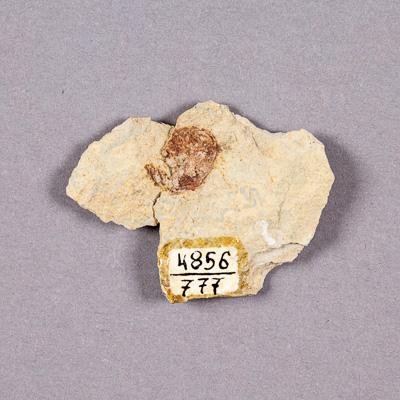 Отпечаток семени гинкгового на породе. Порода представлена плотным алевролитом бежевого цвета.