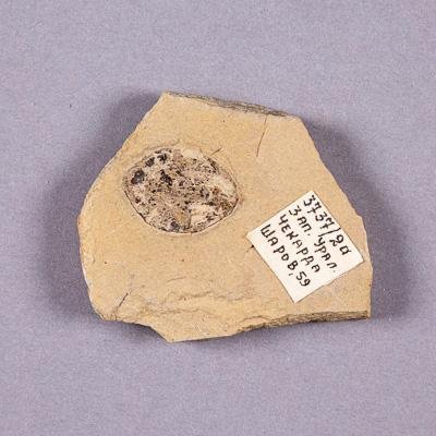 Отпечаток семени гинкгового на породе. Порода представлена плотным алевролитом бежевого цвета.