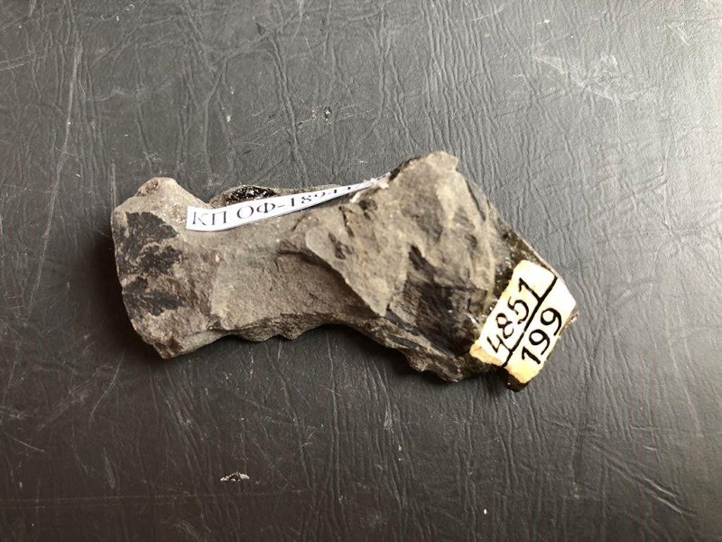 Образец неправильной формы, представляет собой фрагмент керна скважины. Многочисленные отпечатки вайи папоротников с фитолеймами на породе. Вайи стерильные. Порода представляет собой алевролит глинистый, зеленовато-серого цвета.
