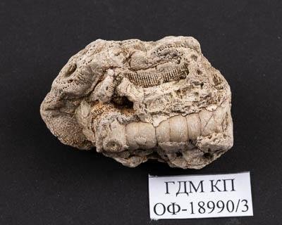 Фаунистический комплекс. Фрагмент стебля морской лилии и фрагмент колонии мшанки. Crinoidea, Fenestella sp. Классификация: Иглокожие Echinodermata, Морские лилии (подтип Crinozoa) Crinoidea;Мшанки Bryozoa, Голоротые Gymnolaemata, Скрыторотые Cryptostomata, Мшанка Fenestella sp.