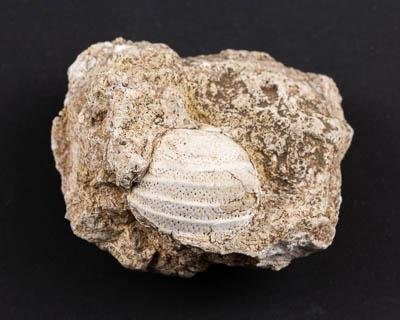 Раковина брахиоподы на субстрате. У раковины четко различимы линии нарастания. Субстрат представлен плотным кристаллическим известняком молочно-белого цвета.