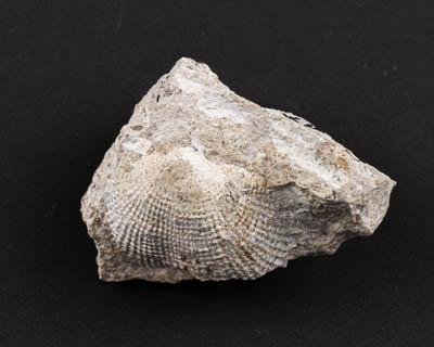 Раковина брахиоподы на субстрате. У раковины четко различимы линии нарастания. Скульптура сетчатая. Субстрат представлен плотным кристаллическим известняком молочно-белого цвета.