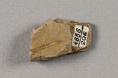 Отпечаток филлоида на субстрате. Филлоид удлиненный. Субстрат представлен светло-бежевым песчаником. Отпечаток побега хвоща пропитан каким-то составом (клеем).