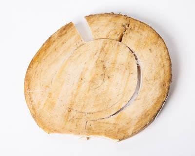 Двусторонний поперечный срез (спил) бивня мамонта, округлый в сечении, молочно-белого цвета. Почти полностью сохранилась внешняя поверхность бивня, окраска бежевая. Бивень рассохся, также был деформирован при высыхании. Обе поверхности спила полированы. На спилах четко различимы линии Шрегера.