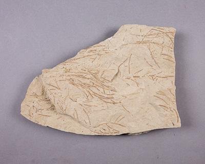 Отпечаток таллома водоросли в образце мергеля неправильной формы. Тело водоросли разделено на длинные тонкие листоподобные ленты. Мергель плотный, твердый, кремового цвета. Водоросли выделяются на поверхности напластования темно-коричневым цветом.