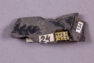 Отпечаток вайи в образце аргиллита неправильной формы. Край перышка рассеченный. Жилкование сетчатое. Аргиллит плотный, темно-серый, однако отпечаток выделяется ещё более насыщенным черным цветом.