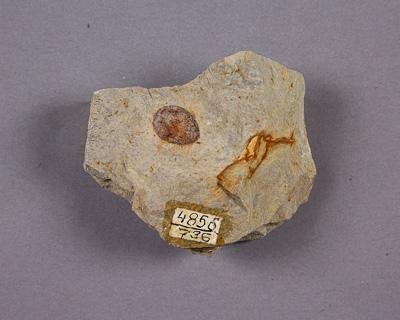 Отпечаток семени гинкгового на породе. Порода представлена плотным алевролитом бежевого цвета.