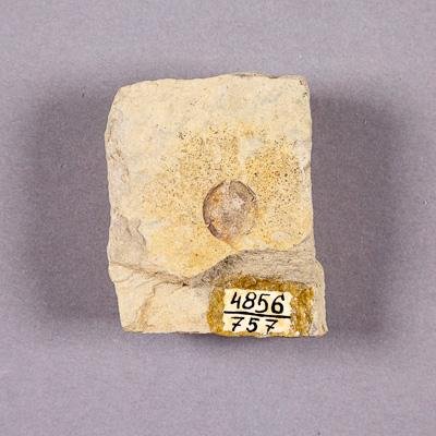 Отпечаток семени гинкгового на породе. Порода представлена плотным алевролитом бежевого цвета.