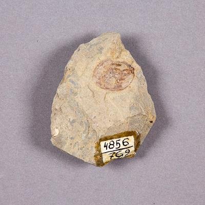 Отпечаток семени гинкгового на породе. Порода представлена плотным алевролитом бежевого цвета.