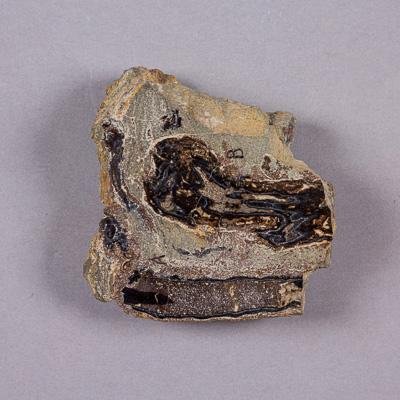 Образец песчаника неправильной формы. Песчаник тонкозернистый очень плотный, зеленовато-серого цвета с рыжеватыми включениями. В песчанике различимы удлиненные трубчатые остатки корней. С одной стороны порода отшлифована. На шлифе различимо два остатка корней, выделяющиеся черным цветом на фоне породы.