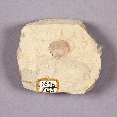 Отпечаток семени гинкгового на породе. Порода представлена плотным алевролитом бежевого цвета.