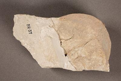 Отпечаток просомы мечехвоста. Панцирь отпечатался с верхней стороны . Порода вырезана в виде параллелограмма. Порода представлена мергелем светло-бежевым.