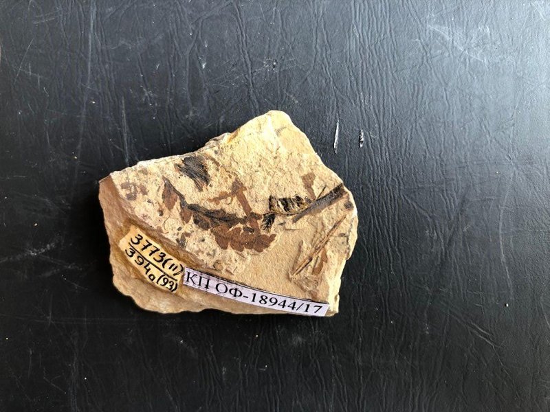 На породе с краю черный отпечаток с фитолеймой изогнутой вайи листа. Расположение перьев очередное. Порода представлена бежевым алевролитом, с редкими черными пятнами.