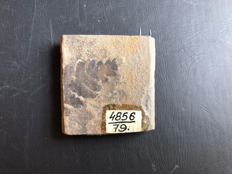 Отпечаток с фитолеймой вайи листа. Больше остатков растений на породе нет. Порода представлена бежевым алевролитом, с редкими черными пятнами.