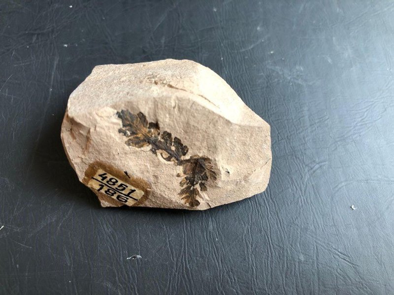 Образец неправильной формы. На породе сохранился отпечаток с фитолеймой двух стерильных листовых пластинок (вайи). Порода представляет собой алевролит светло-бежевого цвета.