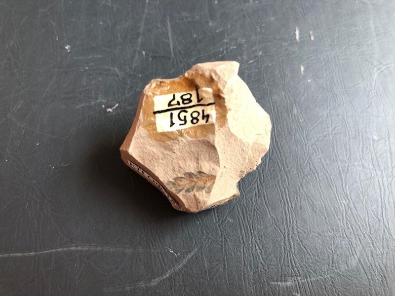 Образец неправильной формы. На породе сохранился отпечаток с фитолеймой стерильной листовой пластинки (вайи). Порода представляет собой алевролит светло-бежевого цвета.