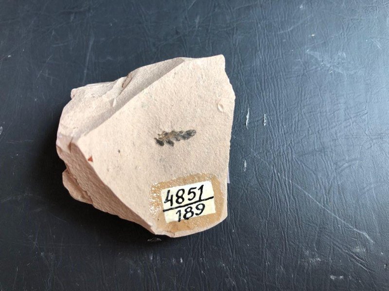 Образец неправильной формы. На породе сохранился отпечаток с фитолеймой стерильной листовой пластинки (вайи). Порода представляет собой алевролит светло-бежевого цвета.