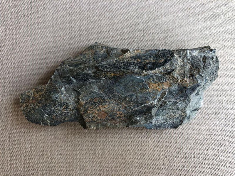 Фрагменты пластин на субстрате. Скульптура мелкобугорчатая, цвет черный. Субстрат представлен очень плотным мелкозернистым песчаником темно-серого цвета, ржаво-рыжего цвета на выветрелой поверхности.