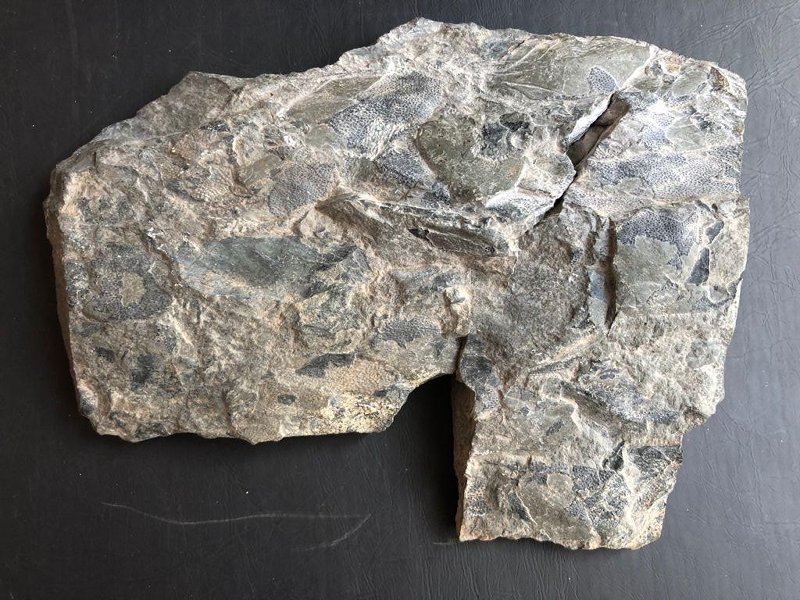 Многочисленные пластины плавника на субстрате. Пластинокожие (панцирные) рыбы. Remigolepis sp. Классификация: Хордовые Chordata, Позвоночные Vertebrata, Пластинокожие рыбы Placodermi, Антиархи Antiarchi, Asterolepiformes