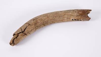 Бивень мамонта, слабо загнутый, овальный в поперечном сечении. Глубина альвеолярной полости 5,3 см. Окраска бивня тёмно-бежевая. Поверхность дистальной половины бивня покрыта многочисленными кавернами (патология?). Возраст: juv