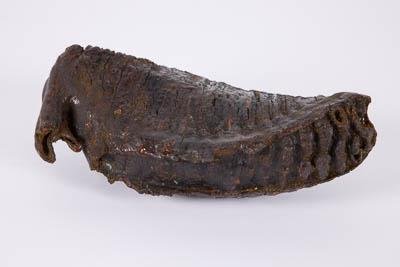 Нижнечелюстной зуб (относительно крупный корень). Последняя смена (M6). Цвет черный (из-за пропитки). Возраст: ad