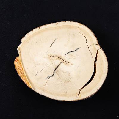 Поперечный двусторонний срез (спил) бивня мамонта, овальный в сечении, молочно-белого цвета с частично сохранившейся внешней поверхностью бивня красновато-коричневого цвета. Спил был сделан неровно, сохранились многочисленные следы от пилы. Бивень рассохся. На спиле четко различимы линии Шрегера.