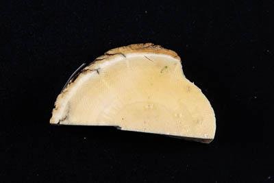 Поперечный двусторонний срез (спил) бивня мамонта, округлый в сечении, молочно-желтого цвета с частично сохранившейся внешней поверхностью бивня красновато-коричневого цвета. Бивень рассохся. С одной стороны спил грубый, неровный, с другой - относительно гладкий, вероятно, полированный. На спиле четко различимы линии Шрегера.