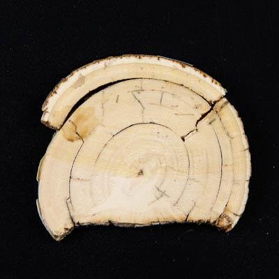Фрагмент (примерно 2/3) поперечного двустороннего среза (спила) бивня мамонта, округлого в сечении, молочно-желтого цвета с частично сохранившейся внешней поверхностью бивня коричневого цвета. Бивень рассохся. Полирован с двух сторон. На спиле четко различимы линии Шрегера.