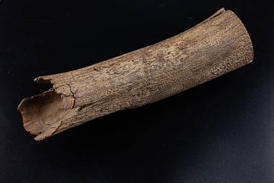 Проксимальный фрагмент бивня мамонта с отполированной поверхностью спила. Бивень округлый в сечении, молочно-желтого цвета с частично сохранившейся внешней поверхностью бивня красновато-коричневого цвета. Бивень рассохся. На спиле четко различимы линии Шрегера. На противоположном конце бивня представлена альвеолярная полость.
