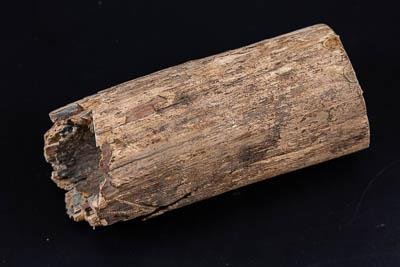 Проксимальный фрагмент бивня мамонта, спиленный с противоположной стороны. Округлый в сечении, молочно-желтого цвета с частично сохранившейся внешней поверхностью бивня темно-коричневого цвета. Бивень рассохся. Спил полированный. На спиле четко различимы линии Шрегера. С необработанного конца, бивень представлен альвеолярной полостью.