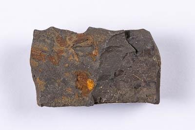 Отпечаток плаунообразного на породе (темно-сером алевролите с коричневыми прожилками).