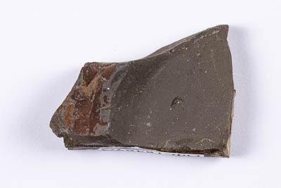 Отпечаток плаунообразного на породе (темно-сером алевролите с коричневыми прожилками).
