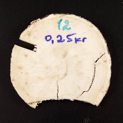 Частично обломанный, двусторонний срез (спил) бивня мамонта молочно-желтого цвета с частично сохранившейся внешней поверхностью бивня темно-коричневого цвета. Спил полирован с двух сторон. На спиле четко различимы линии Шрегера. Возраст: ad